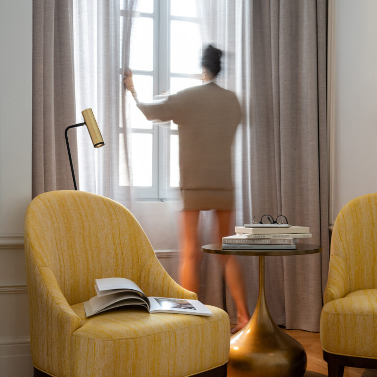 Characterised by generosity of space and refined touches, the Grand Deluxe Rooms offer a unique blend of comfort and style. Showcasing custom-made furnishings, specially designed decorative elements and precious contemporary artworks, these rooms are ideal for two adults who prioritize comfort above all else. From the first-floor room, guests can access the charming hotel courtyard through their balcony door, while the Grand Deluxe Room located on the second floor offers a large window with views towards the courtyard and neighbouring rooms. All rooms from this category offer a sophisticated desk area, custom-made personal bar, coffee & tea station with delicious treats. The ultra-spacious marble bathrooms feature a large walk-in rain-shower, accessible for people with mobility limitations, along with luxurious bathroom amenities and thoughtful details. Grand Deluxe Rooms are located on the first and second floors of the hotel.